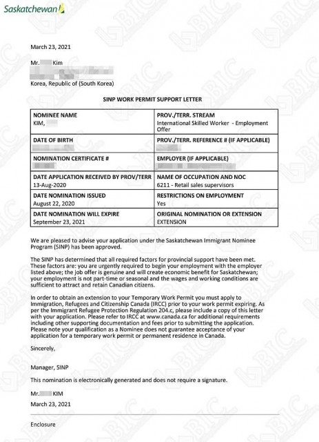 [캐나다] 양**님 SK주 SINP Nomination 승인완료