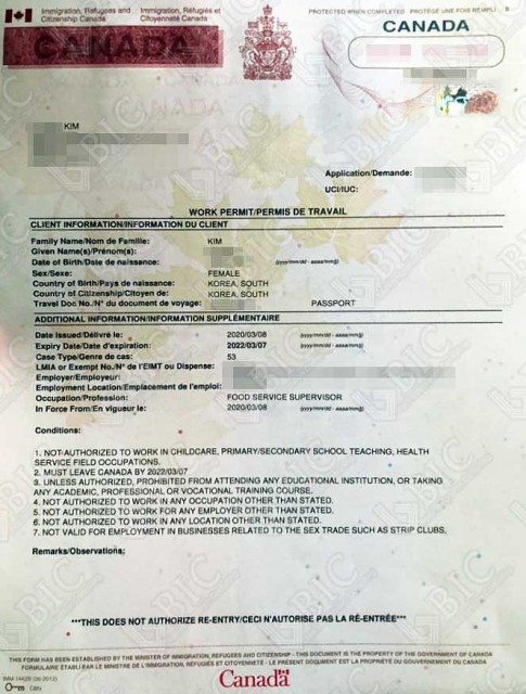 [캐나다] 노**님 SK주 임시워크퍼밋(Temporary work permit)