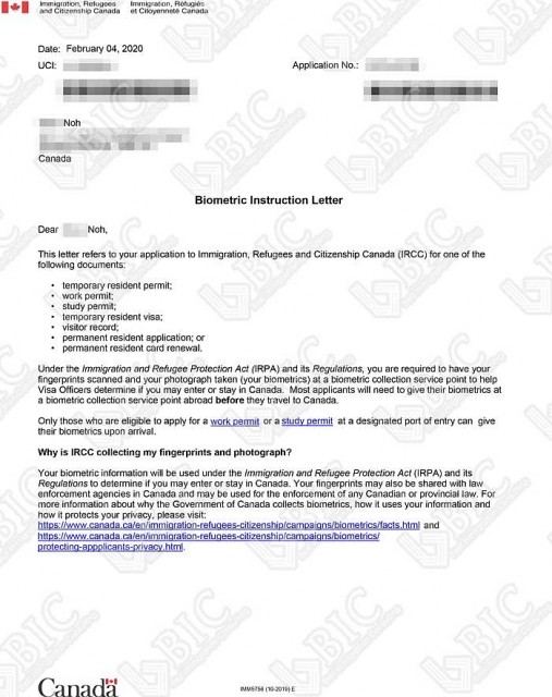 [캐나다] 신**님 Biometric Information(생체검사) 승인완료