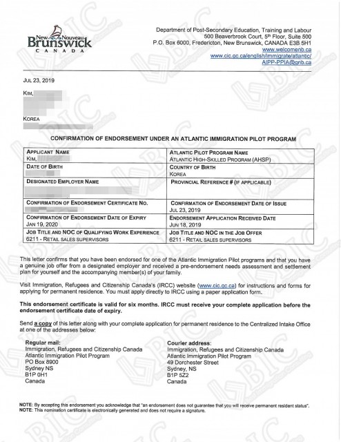 [캐나다] 장**님 SK주 SINP Job Approval 승인완료