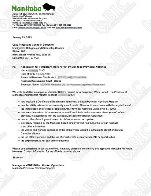 [캐나다] 최**님 MB주 MPNP 영주권 추가서류 요청서